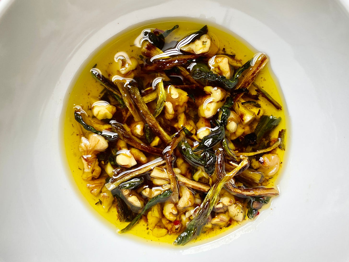 2. Sauté until they have a nice char, and use their strong flavor to infuse your olive oil. Use the oil as a base for dressings or aiolis. Maybe go the distance and make this Ramp and Walnut Pistou. Toast a handful of meaty walnuts, char a bunch of ramps in a skillet, then chop everything up and mix with a generous glug of olive oil, vinegar, chili flakes, and flaky salt. Spoon this over anything & everything — roasted salmon, steak, eggs. Yum.